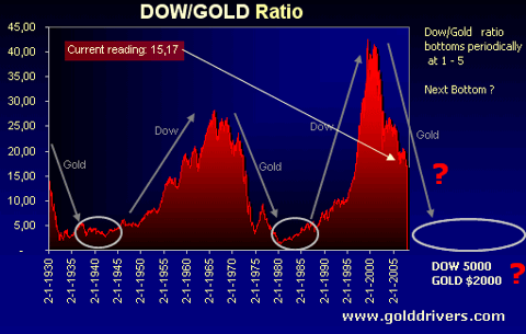 often blamed on president Bush who took office just as the DOW/Gold ratio broke
