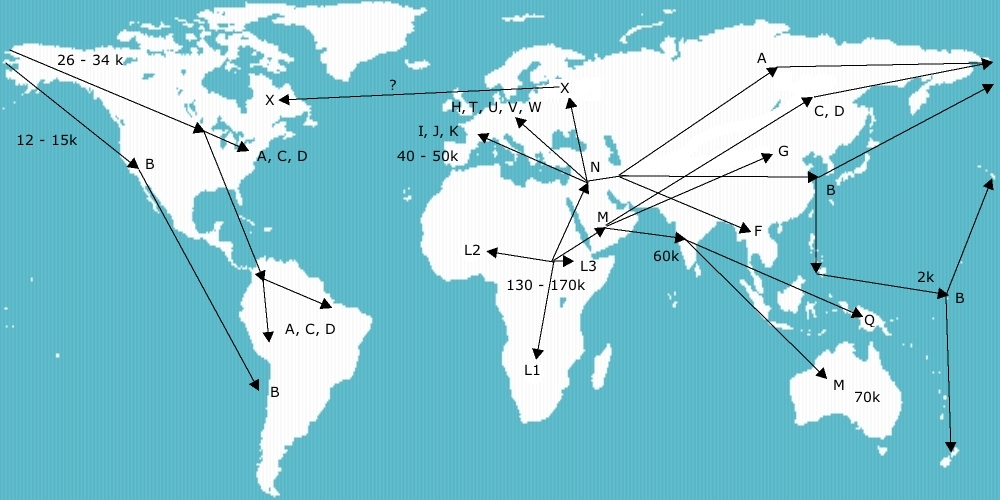 MtDNA migrations, with approximate dates before present (k = 1000)